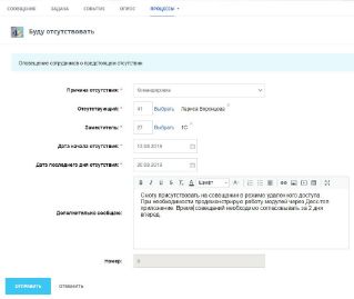 Отправить оповещение о времени отсутствия, заместителя на время отсутствия и дополнительно поручения, к кому по каким вопросам обращаться. Оповещение уходит в живую ленту и доступен реестр для просмотра (при необходимости).