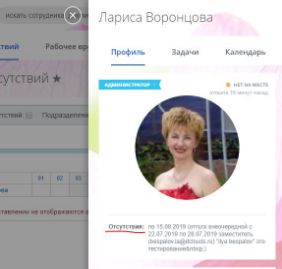 В карточке сотрудника отображается информация отсутствия на рабочем месте: причина, период отсутствия и к кому обращаться с вопросами