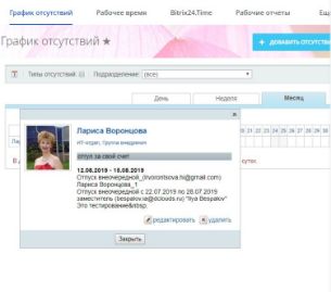 В графике отсутствия компании видно кого нет на рабочем месте, причина, период отсутствия и к кому обращаться с вопросами